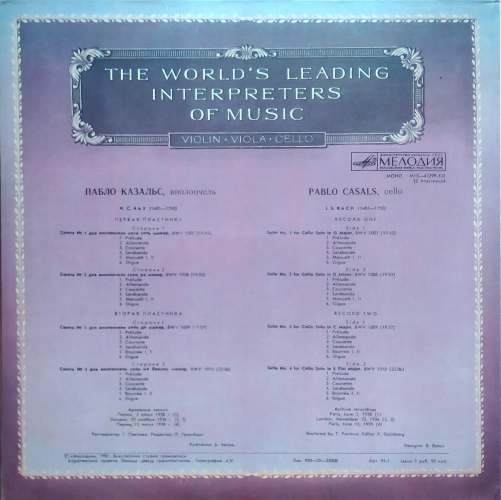 Пабло Казальс. Виолончель. Из Сокровищницы Мирового Исполнительского Искусства. Скрипка-альт-виолончель (2*LP)