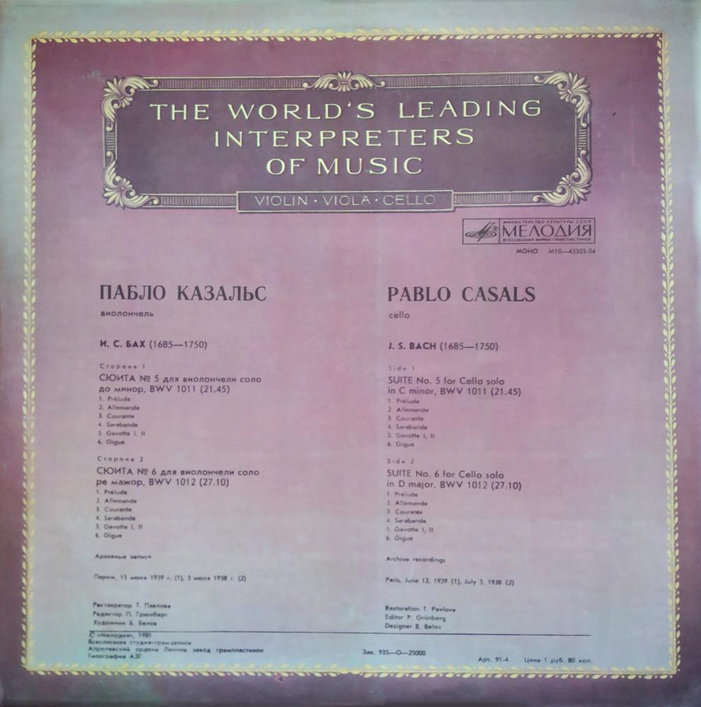 Пабло Казальс. Виолончель. Из Сокровищницы Мирового Исполнительского Искусства. Скрипка-альт-виолончель (LP)