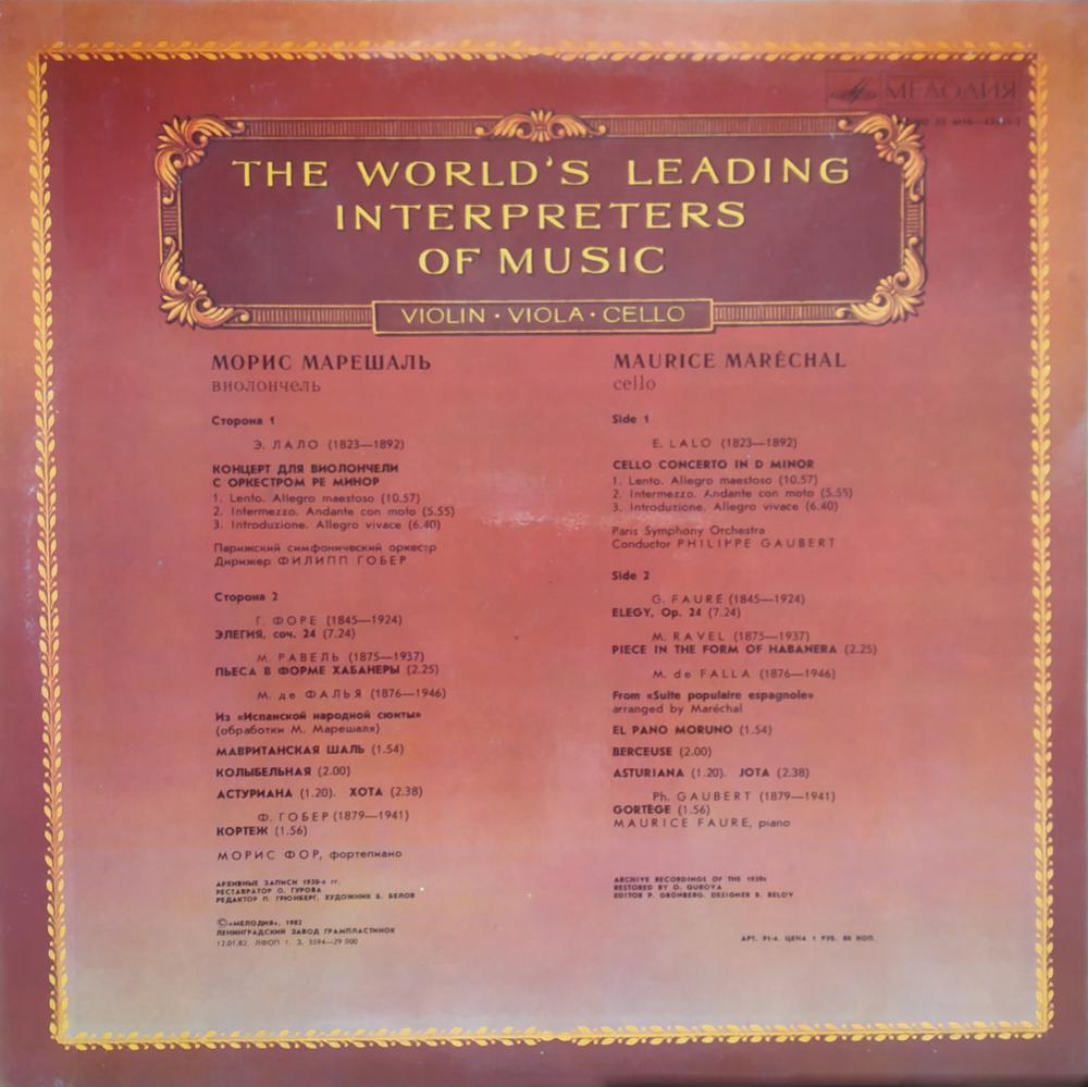 Морис Марешаль. Виолончель. Из сокровищницы мирового исполнительского искусства. Скрипка, альт, виолончель. (LP)