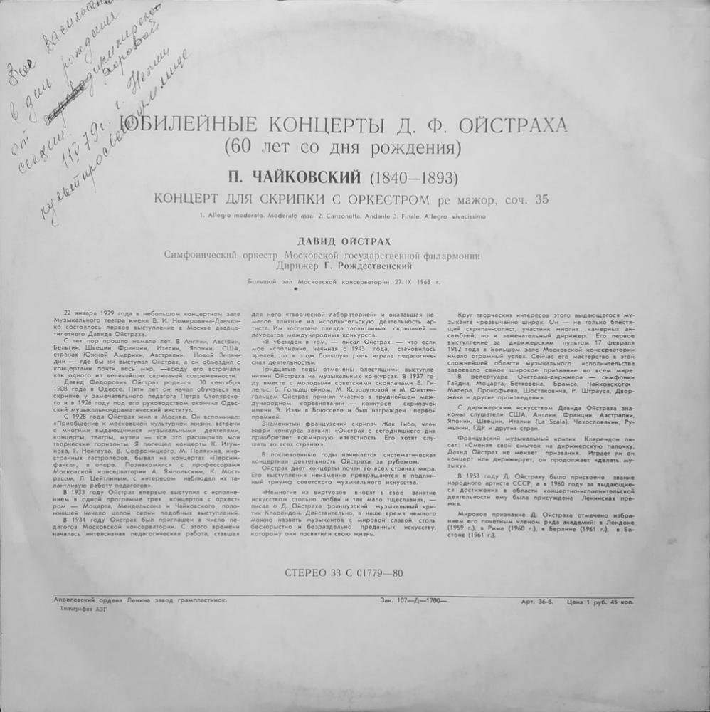 П.Чайковский. Концерт для скрипки с оркестром ре мажор, соч.35 (LP)